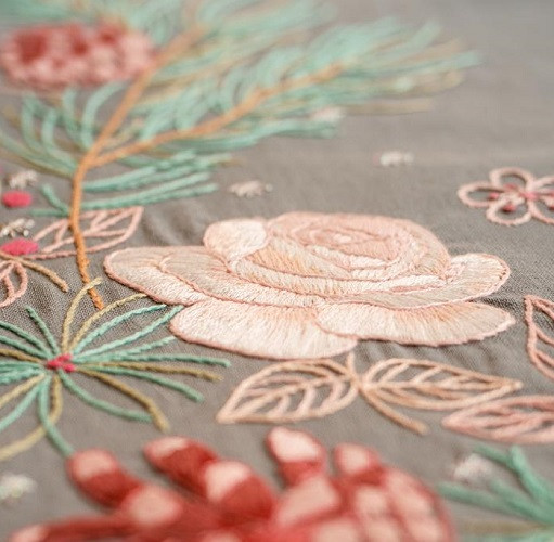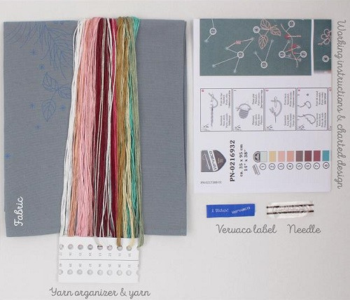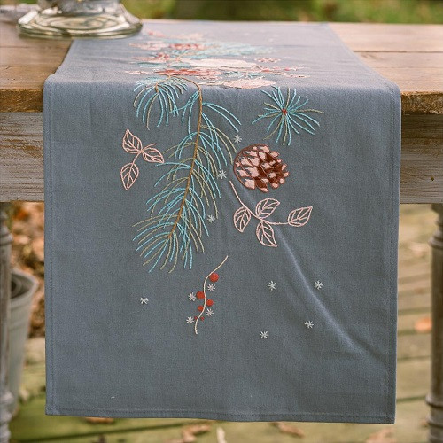 Szürke vászonra készíthető hímzés. A minta visszafogott színvilágú fonallal készül. Kedves és egyszerre modern minta, mely garantáltan egyedivé teszi az asztalt vagy a komódot. A szürke vászonra a minta kékkel van nyomva.