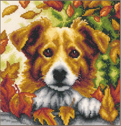 Igazi, őszi csendélet kutyarajongóknak. Nagyon részletgazdag, kedves kép keresztszemmel hímezve.